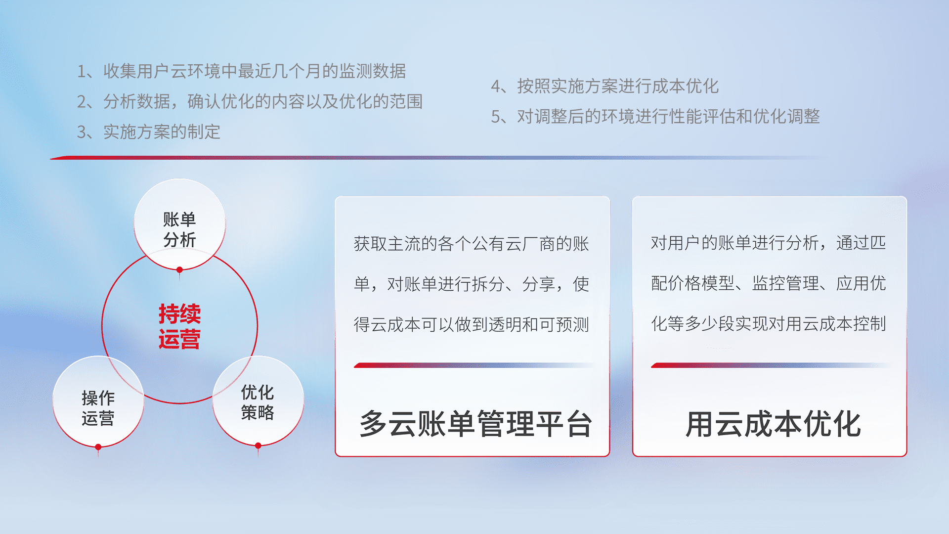 通过多云纳管,,,以统一的资源数据模型把客户的云资源进行抽象和封装,,,进而实现对多云资源的统一操作,,保障云资源管理的可靠性、、、、稳定性与可用性。。量身定制化运维内容,,,,配置、、开发运维、、补丁管理、、备份、、监控、、认证和访问管理、、、审计和日常巡检等,,,,保障在用云过程中的可靠度,,稳定度以及高可用率。。